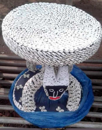 Tabouret Traditionnel Bamiléké – Blanc et Multicolore – Caurie et Tresse
